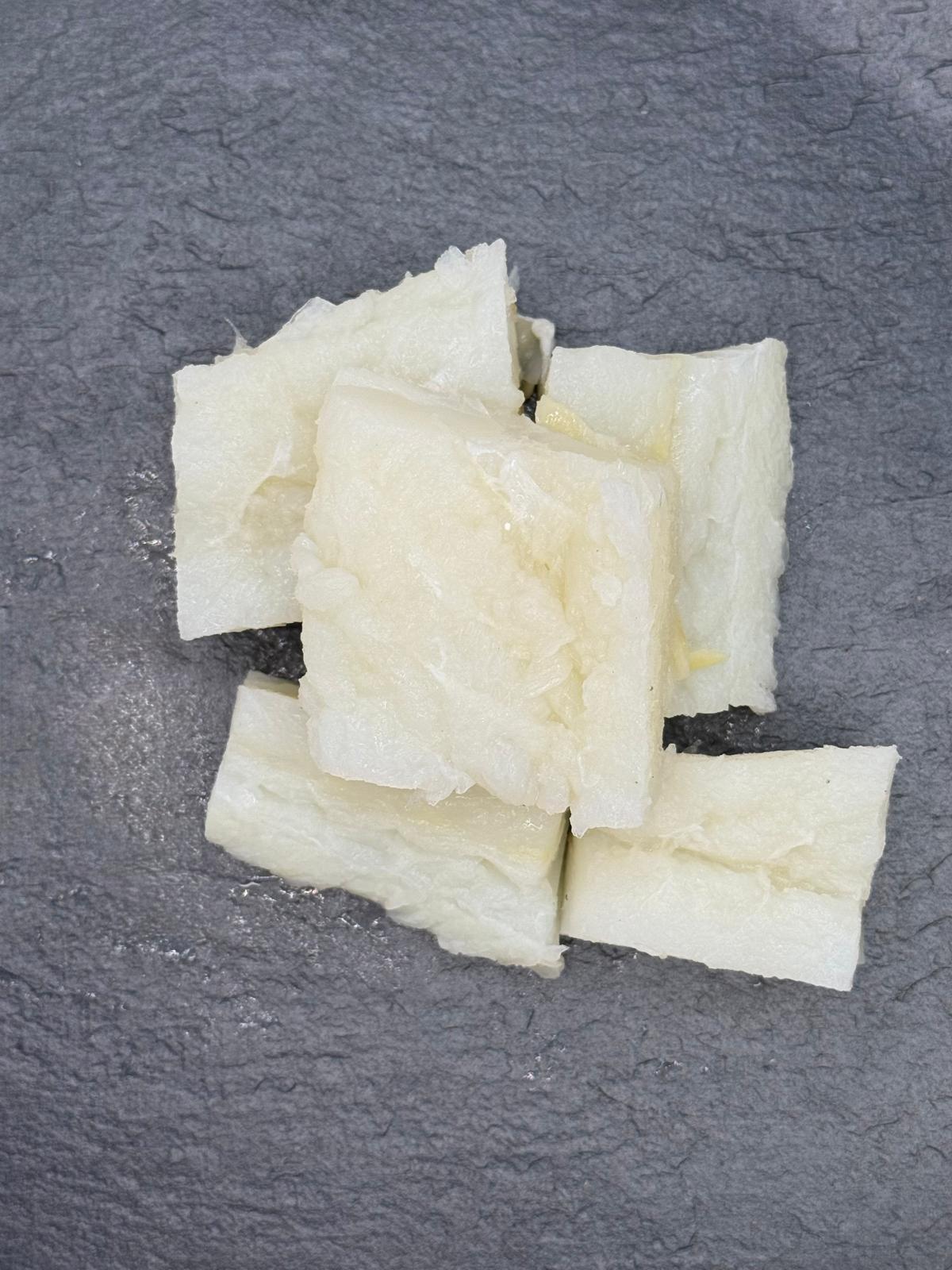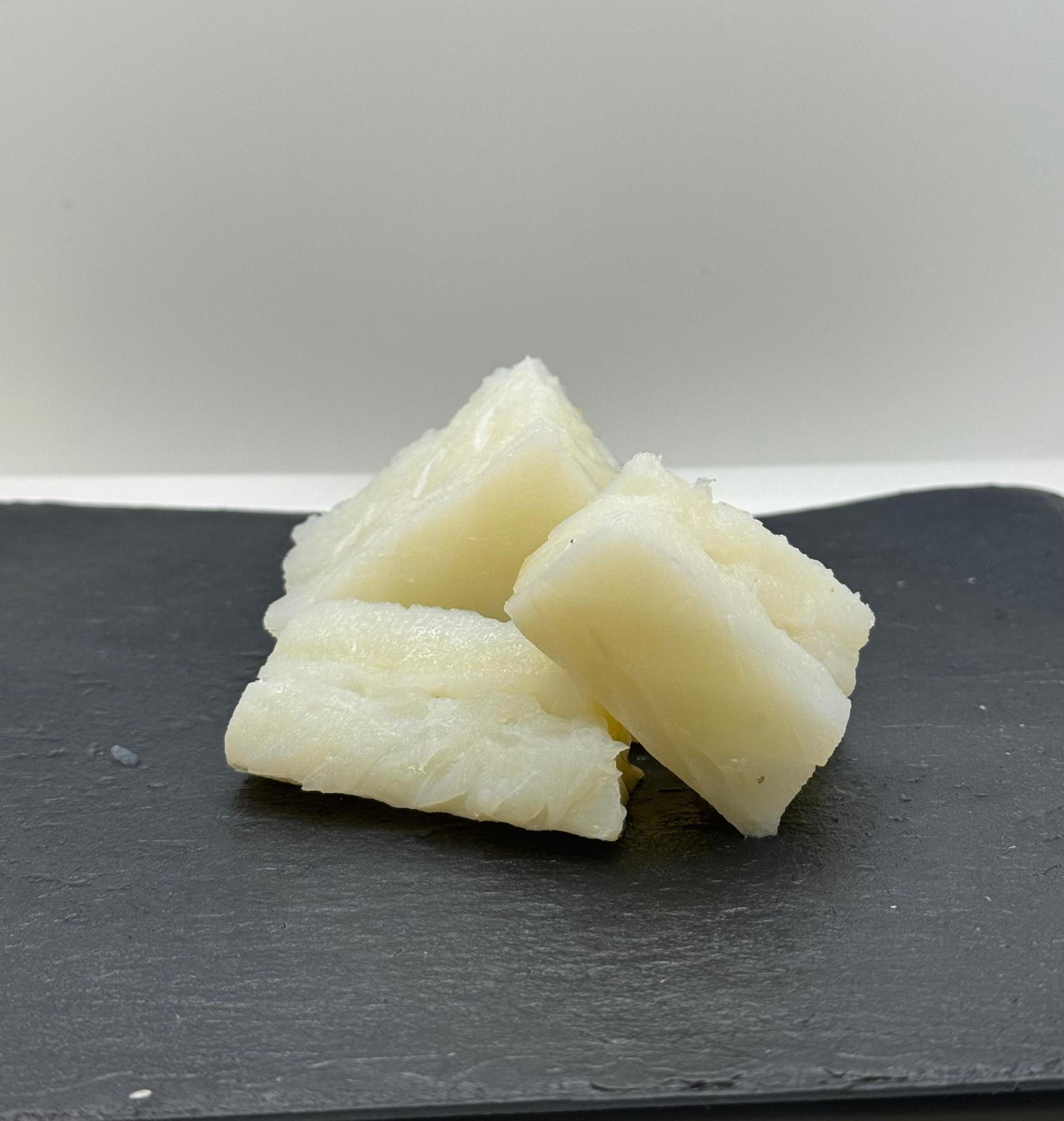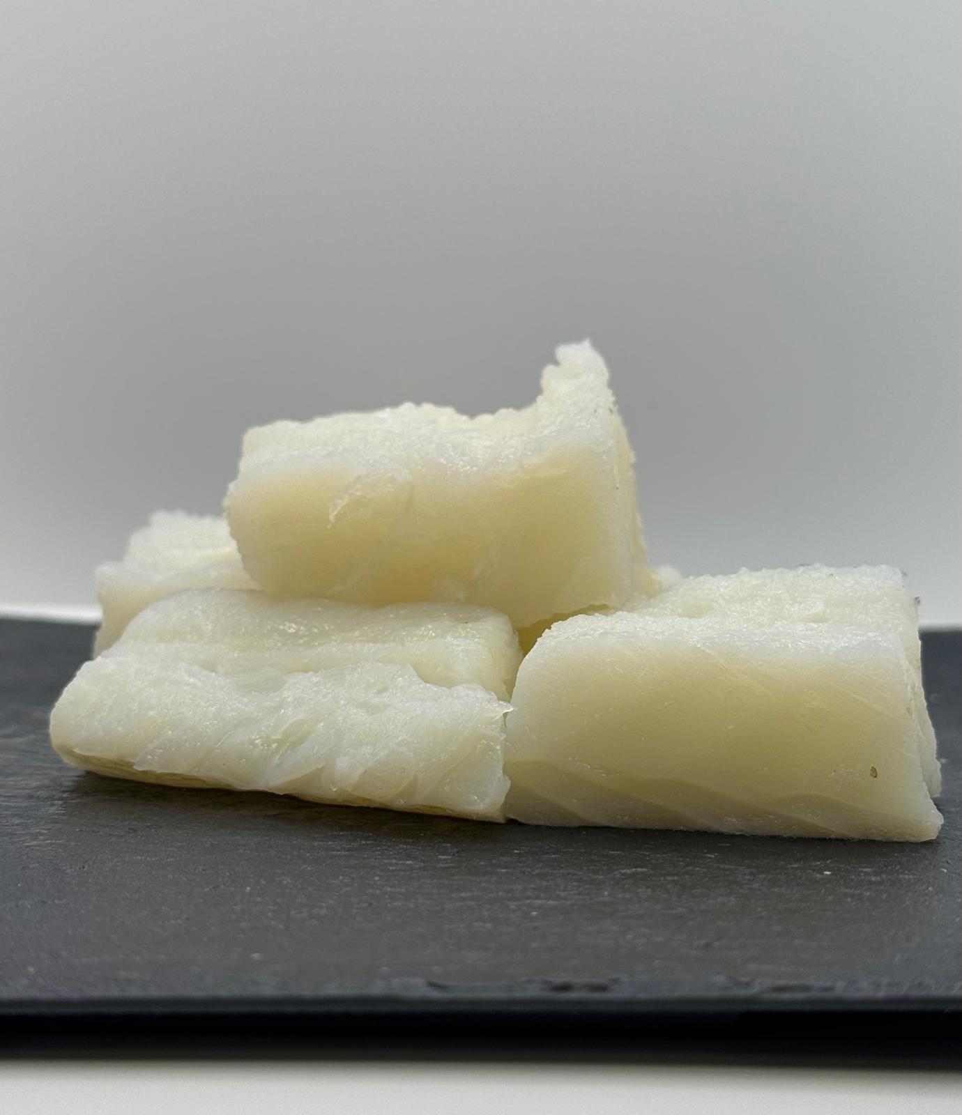 Pequeños trozos de bacalao desalado, listos para consumir. Ideal para escalibada con pimientos confitados y cebolla fresca.